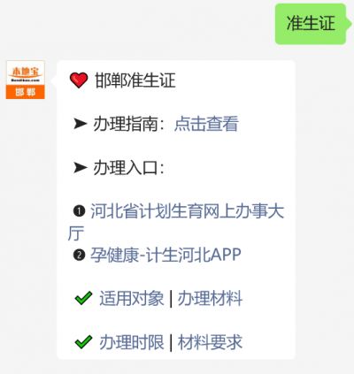温馨提示:微信搜索公众号【邯郸本地宝】,关注后在对话框回复【准生证】可获河北省准生证办理入口、办理条件、办理材料等详细信息,持续获取邯郸市准生证办理最新动态。